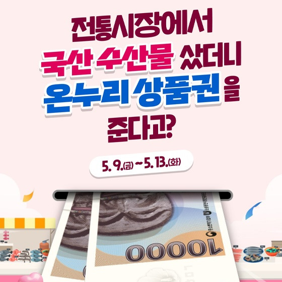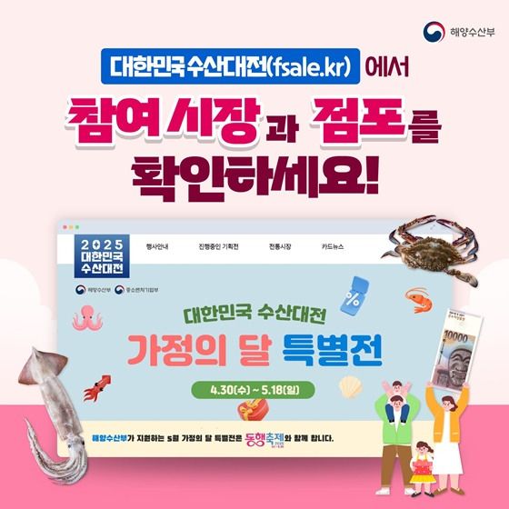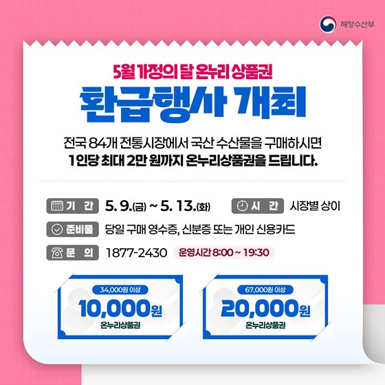 5월 가정의 달을 맞아 전통시장 활성화와 국산 수산물 소비를 촉진하기 위해 전국 84개 전통시장에서 진행되는 행사입니다.