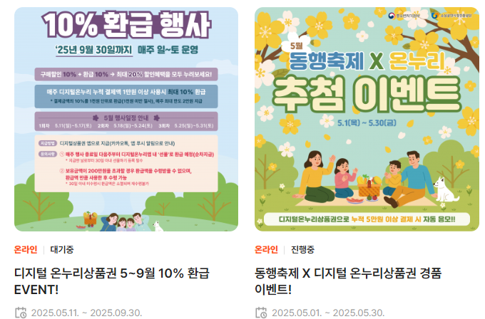 이번 온누리상품권 환급 행사는 2025년 5월 9일(금)부터 5월 13일(화)까지 약 5일간 진행됩니다.