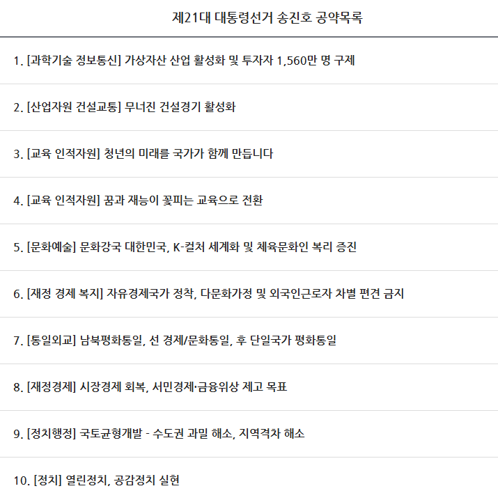 송진호 후보는 과학기술과 경제, 교육, 문화 등 다양한 분야에서의 발전을 목표로 하는 공약을 제시하고 있습니다.