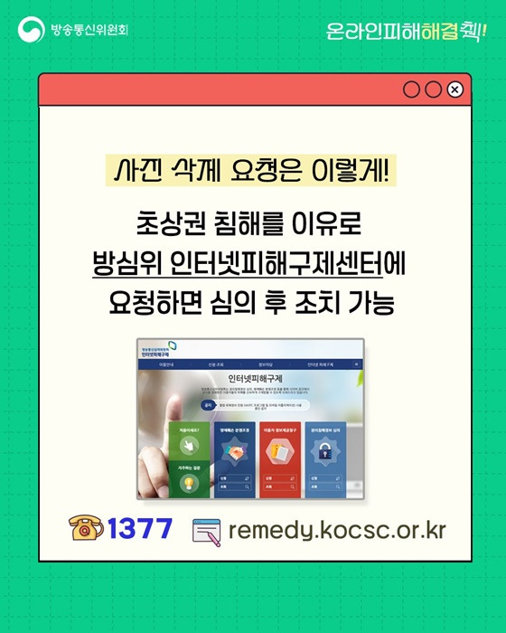 이 경우 인터넷피해구제센터(☎1377)를 통해 피해 사실을 신고하면, 해당 기관이 심의 후 게시물 삭제 또는 차단 조치를 해줍니다.