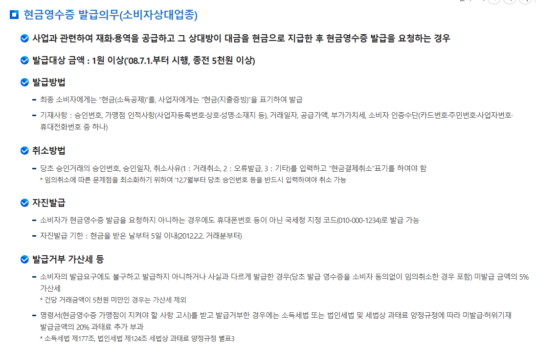‘의무발행업종’에 해당하는 사업자는 소비자가 요청하지 않더라도, 건당 10만 원 이상 현금거래 시 반드시 발급해야 합니다.