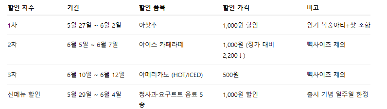 이번 행사는 하루 평균 기온이 크게 오르는 6월 초, 커피 음료를 즐기려는 고객에게 파격적인 혜택을 제공하는 기회입니다.