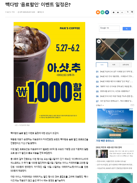 국내 대표 커피전문점 브랜드 중 하나인 빽다방(BbaekDaBang)이 2025년 여름 시즌을 맞아 대규모 할인 이벤트를 전격 실시합니다.