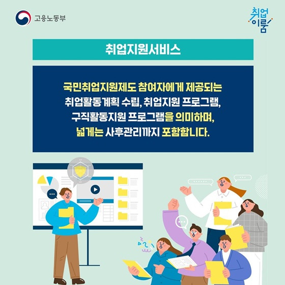 이 프로그램은 취업지원서비스 기간 내 반드시 포함되어야 하며, 서비스 종료 전 3개월 동안은 집중 취업알선기간으로 전환되어 더 적극적인 지원이 이루어집니다.