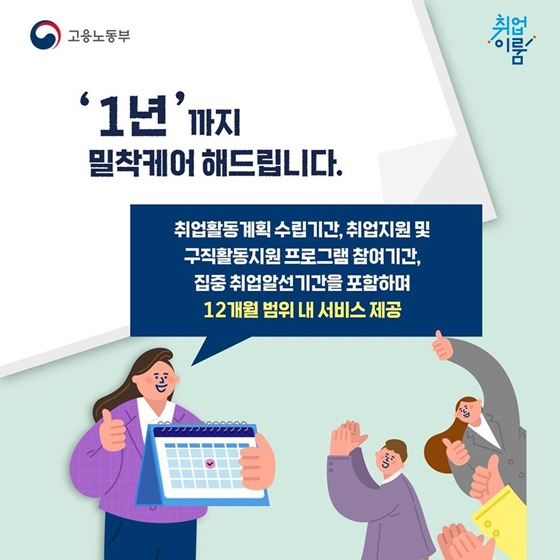 집중 취업알선기간은 서비스 종료 전 3개월 동안, 보다 밀도 있는 취업 연결 서비스가 이루어지는 기간입니다.