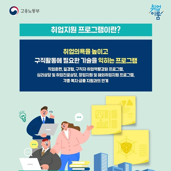 이처럼 취업지원 프로그램은 구직자가 처한 상황에 맞게 유연하게 구성되며, 다양한 정부 부처 및 지자체 프로그램과도 연계됩니다.