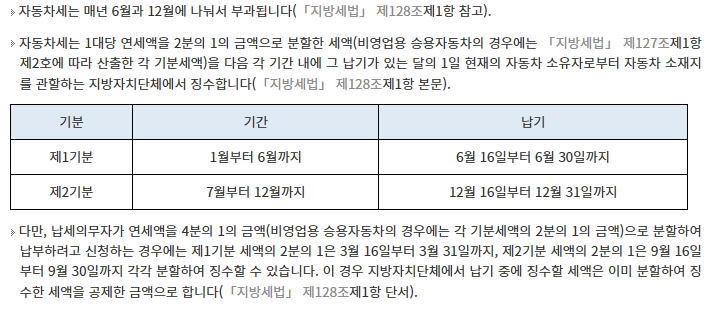 이를 정기분 자동차세 납부라고 부르며, 아래와 같이 두 시기로 나누어 고지서가 발송됩니다.