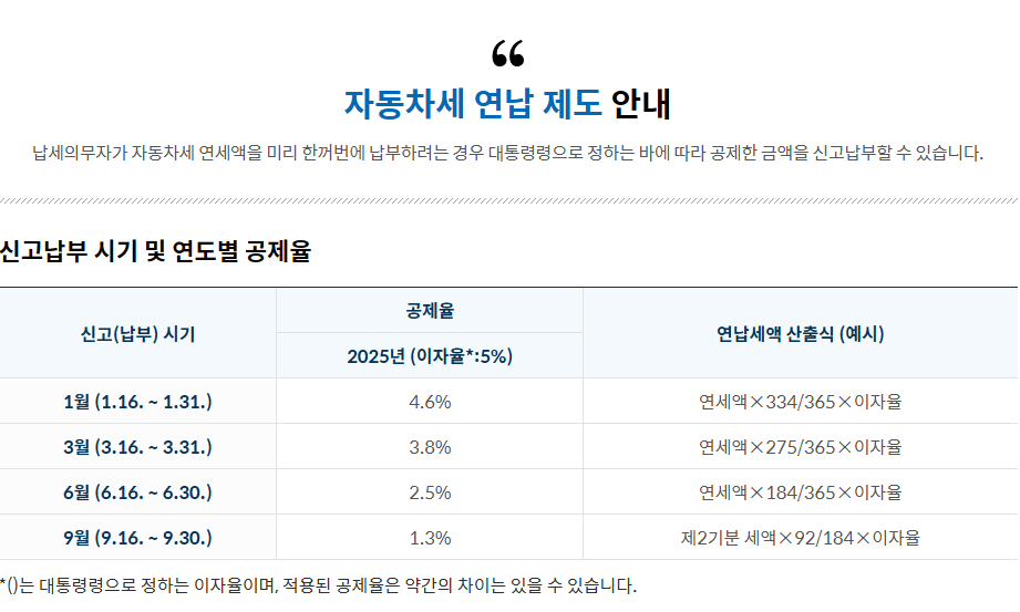자동차세 연납이란, 매년 1월에 1년 치 세금을 한 번에 납부하고 일정 금액을 할인받는 제도입니다.
