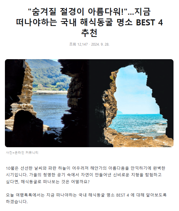 이번 글에서는 전국 각지에 위치한 동굴이 있는 대표 해변 명소를 소개합니다.