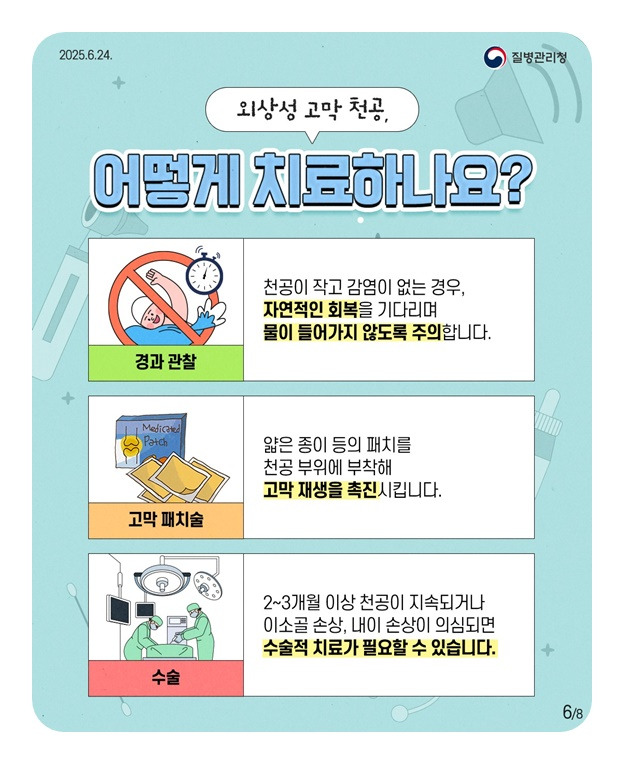 천공이 2~3개월 이상 회복되지 않거나, 중이 또는 내이의 손상이 의심되는 경우에는 수술이 필요합니다.