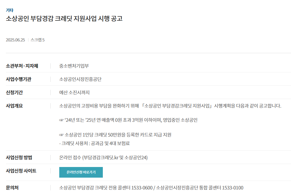 부담경감 크레딧은 2024년 또는 2025년 연매출 3억 원 이하 소상공인을 대상으로, 전기·가스·수도 등 공공요금 및 4대보장제도 이용료 납부 시 사용할 수 있는 디지털 포인트 50만 원을 지급하는 사업입니다.