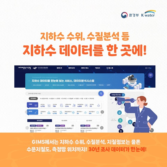 환경부와 지하수이행관리원, 한국수자원공사가 협력하여 구축한 시스템으로, 지하수 위치, 수위, 수질, 지질 자료 등 방대한 데이터를 실시간으로 조회할 수 있도록 설계되어 있습니다.