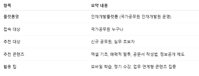 국가공무원 인재개발원이 운영하는 이 플랫폼은 단순한 교육용 포털이 아닌, 정부와 민간의 실무형 콘텐츠를 통합 제공하여 현업에 바로 활용할 수 있는 ‘공무원 전용 실무 아카이브’로 진화하고 있습니다.