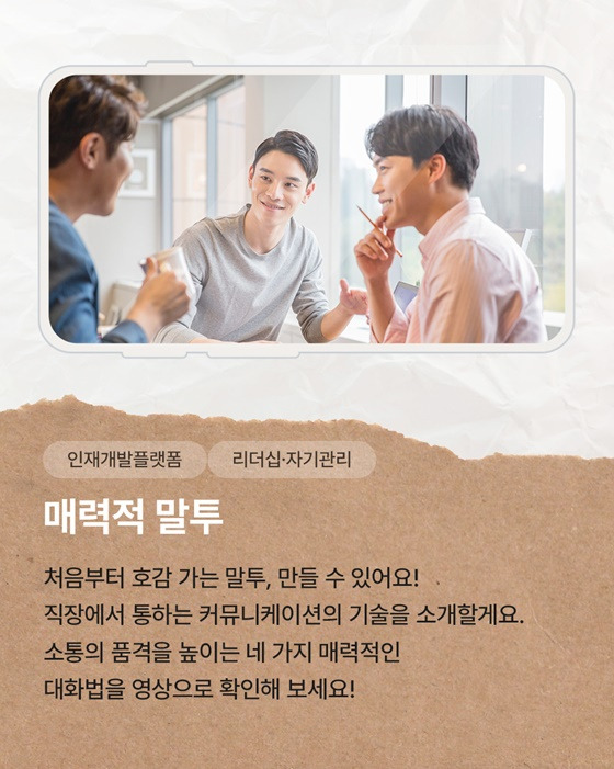 이 콘텐츠는 매끄러운 커뮤니케이션을 위한 실전형 대화 전략을 영상으로 제공하여, 단기간에 ‘호감형 말투’를 익히는 데 도움을 줍니다.