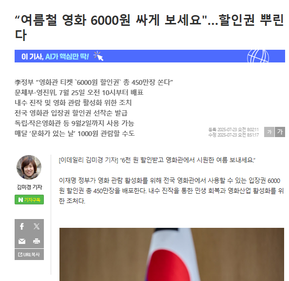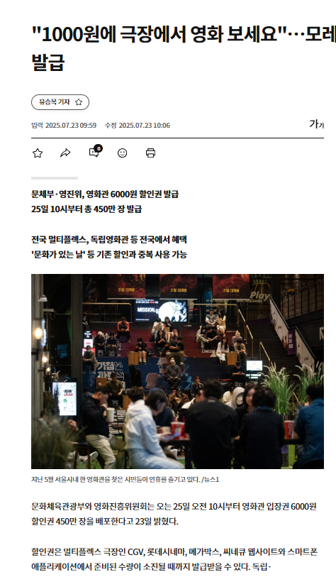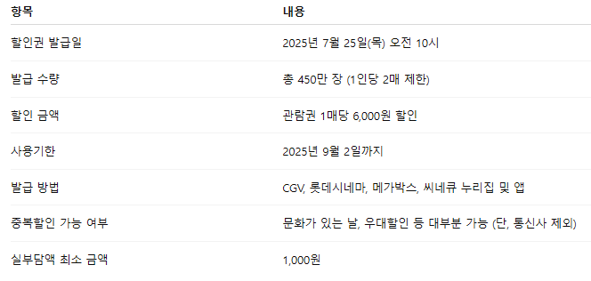이 할인권은 총 450만 장 규모로 전국 동시 선착순 배포되며, 할인권을 활용하면 일부 관람일에 최저 1,000원으로 영화 한 편을 감상할 수 있습니다.