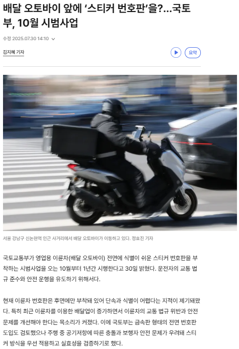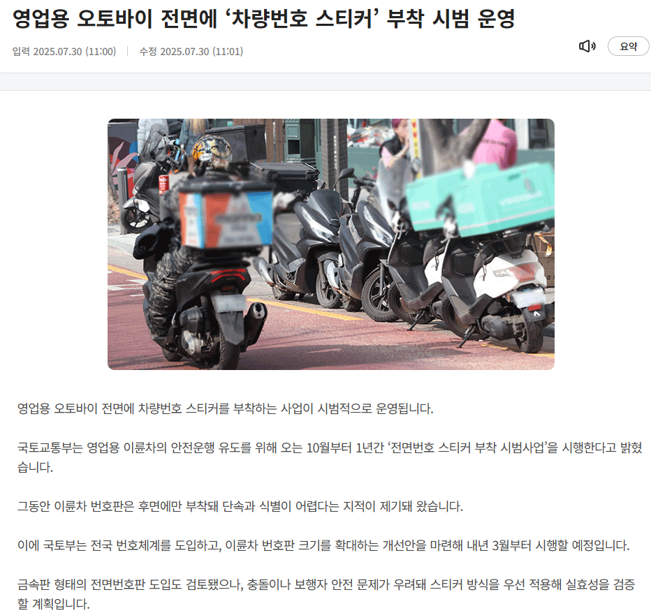 2025년 10월부터 국토교통부는 영업용 이륜차에 전면번호 스티커를 부착하는 시범사업을 본격적으로 시행합니다.
