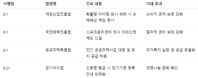 2025년 8월부터 시행되는 법령은 게임 산업, 스포츠 문화, 주거 정책, 생명윤리 분야에 걸쳐 사회 전반의 시스템을 보다 투명하고 공정하게 바꾸기 위한 기반을 마련합니다.