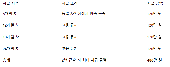 ✅청년이 근속 6개월, 12개월, 18개월, 24개월 시점마다 120만 원씩, 총 480만 원 지급