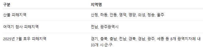 A. 산불 피해지역(산청, 하동, 안동 등 8곳), 여객기 참사 피해지역(전남, 광주), 2025년 7월 호우 피해지역(경기, 충북, 충남, 전남, 경북, 경남, 광주, 세종 등 8개 광역지자체 내 33개 시·군·구)이 포함됩니다.