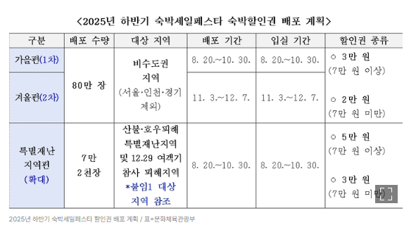 문화체육관광부와 한국관광공사가 주관하는 2025 하반기 ‘숙박세일페스타’가 오는 8월 20일 오전 10시부터 시작됩니다.
