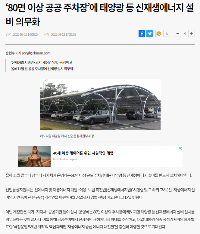 산업통상자원부가 신에너지 및 재생에너지 개발·이용·보급 촉진법 시행령과 신·재생에너지 설비의 지원 등에 관한 규정 일부 개정안을 발표하며, 80면 이상 공공주차장에 태양광발전 설비 설치를 의무화하는 방안을 입법예고했습니다.