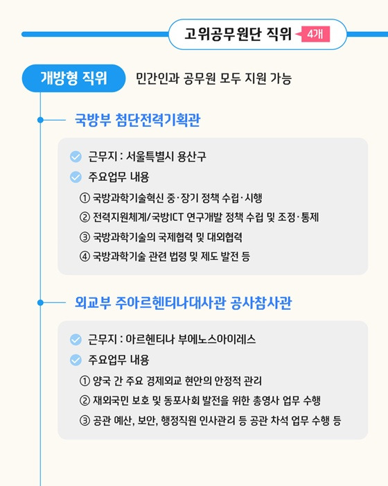 아래는 이번 공모에서 공개된 7개 직위와 주요 업무 요약입니다. (근무지 표기 포함)