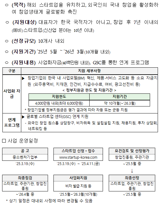 본 사업은 해외 창업 기업 및 외국인 창업가가 국내에서 안정적으로 창업할 수 있도록 돕는 프로그램입니다.