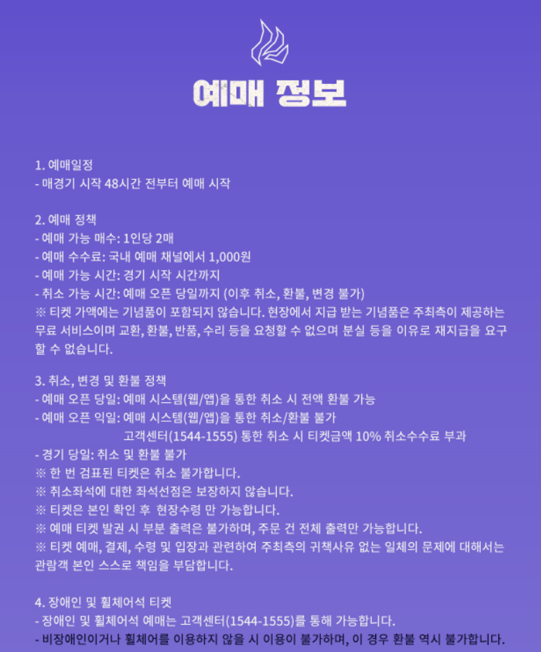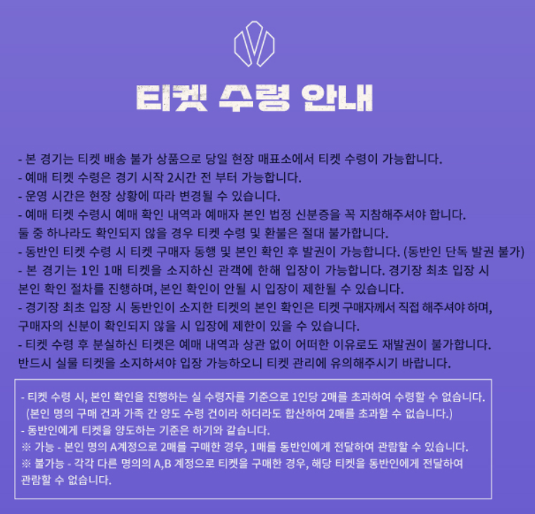 예매한 티켓은 경기 당일 현장에서 수령할 수 있습니다.