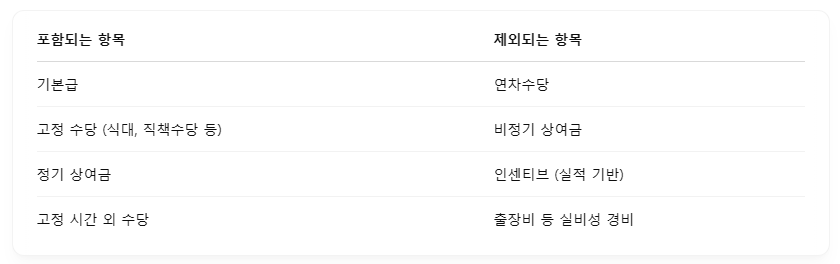 고정 수당 (식대, 직책수당 등) ⭕ / 비정기 상여금 ❌
