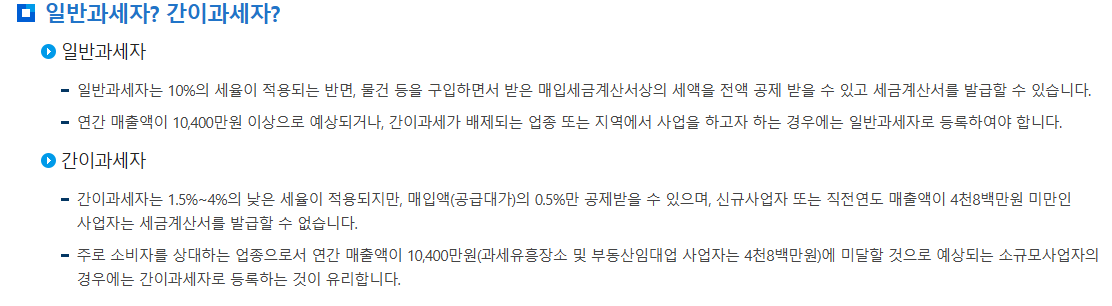 사업자 유형에 따라 일반 또는 간이과세자 선택
