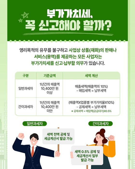 영리 목적의 유무와 관계없이, 대한민국에서 상품을 판매하거나 서비스를 제공하는 모든 사업자는 부가가치세를 신고하고 납부해야 합니다.