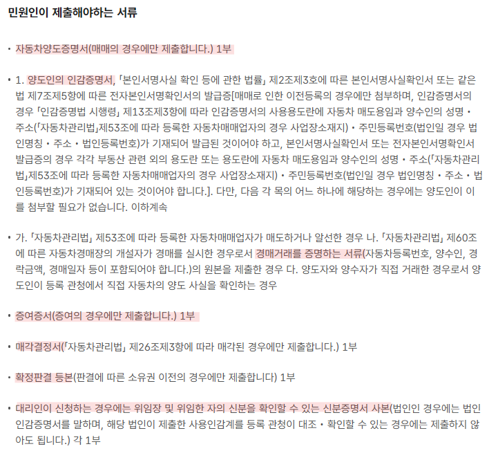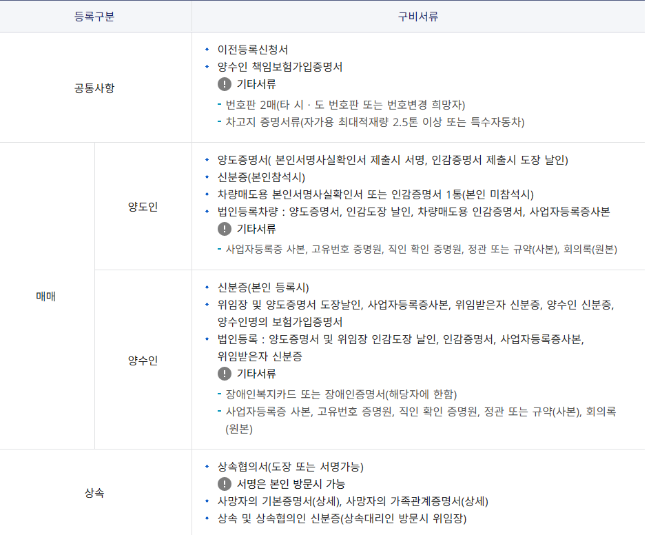 자동차 이전 등록을 위해서는 기본적으로 다음과 같은 서류가 필요합니다.