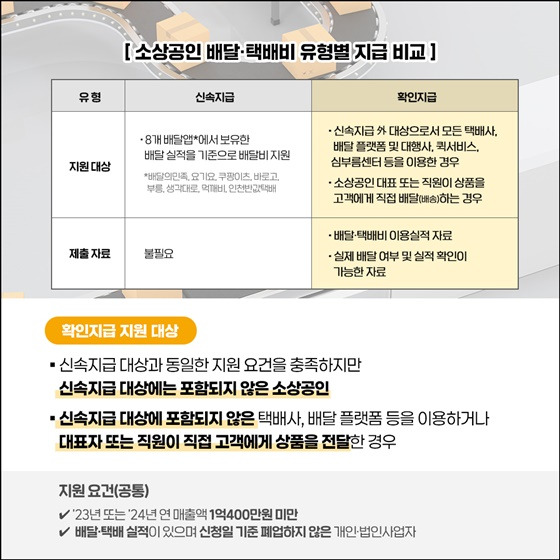 또한, 배달·택배 실적이 있어야 하고, 신청자는 2023년 또는 2024년의 실적을 기준으로 지원을 받게 됩니다.