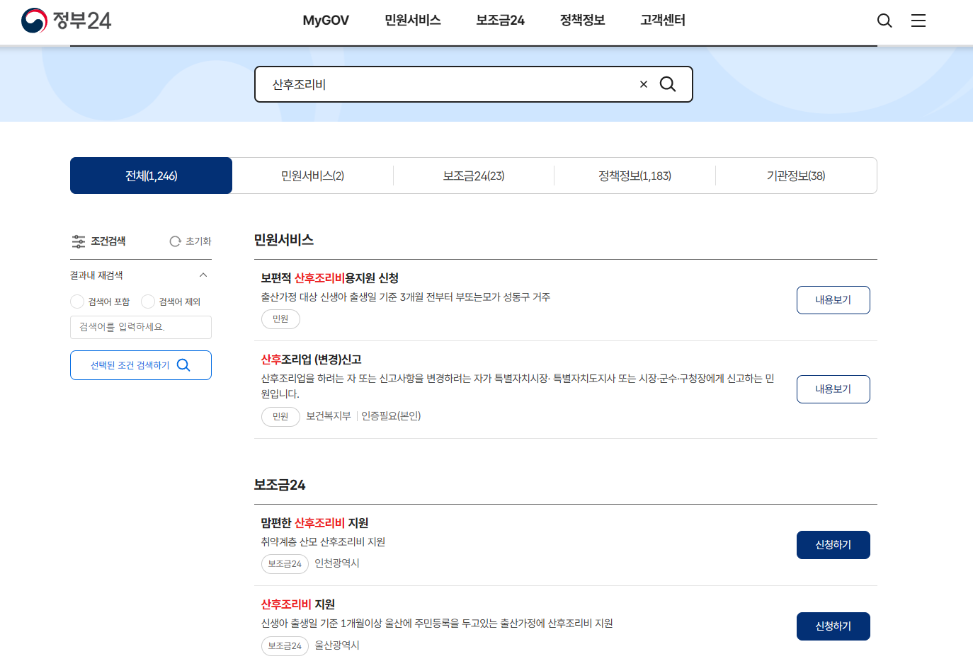 ☑️‘산후조리비 지원’ 또는 거주 지역명을 포함한 서비스명 검색