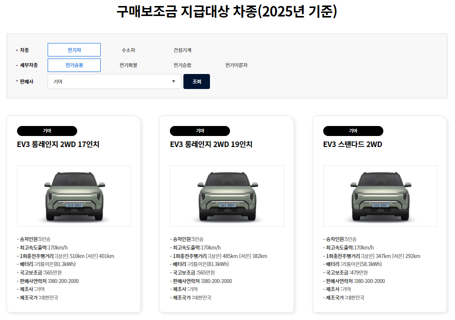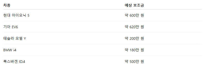 아래는 2025년 주요 전기차 모델별 예상 보조금 액수를 정리한 표입니다.