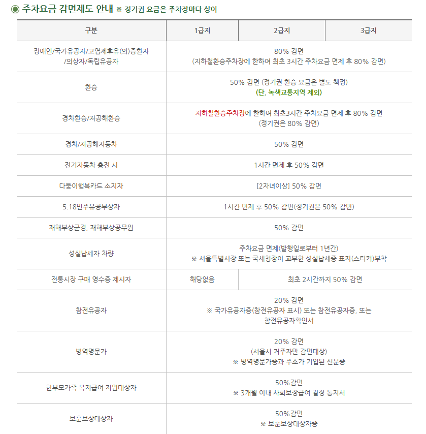 ※ 감면 혜택을 받기 위해서는 해당 증빙서류를 제시해야 하며, 일부 주차장은 사전 등록이 필요할 수 있습니다.